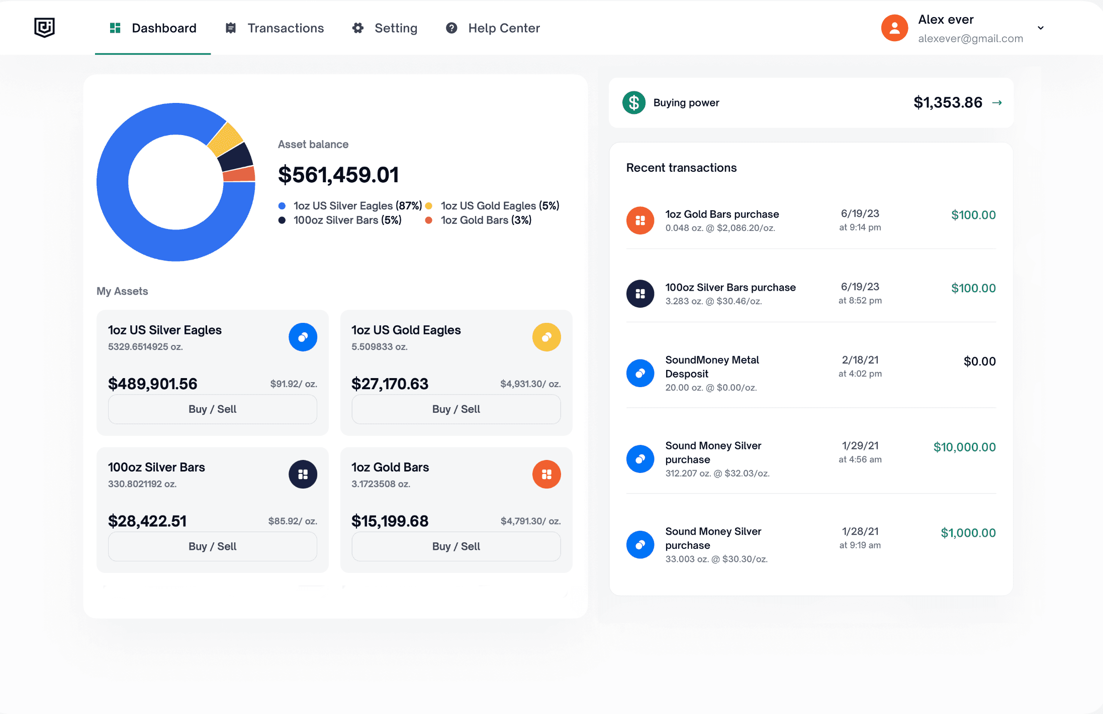 Zamień codzienne pieniądze w prawdziwe bogactwo, któremu możesz zaufać. Kupuj, przechowuj i likwiduj prawdziwy fizyczny metal przechowywany w bezpiecznych skarbcach, z przejrzystymi cenami, płynnością gotówkową jednym kliknięciem na konto bankowe i dostawą dostępną wtedy, gdy chcesz wejść w posiadanie.